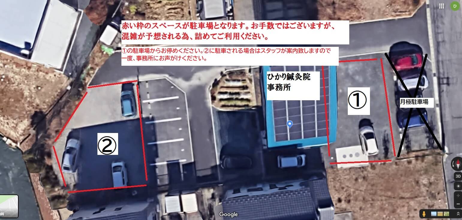 約10台の駐車スペースが御座います。①の駐車場からお停めください。②の駐車場をご利用の場合はスタッフが案内致しますので、一度事務所にお声がけください。