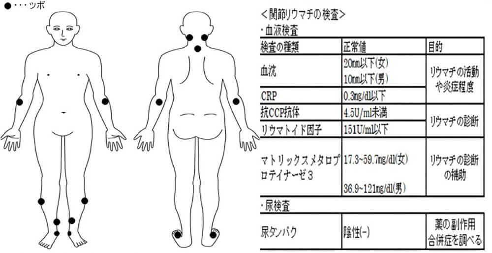 手足の関節で起こりやすく、左右の関節で同時に症状が生じやすいことも特徴です。