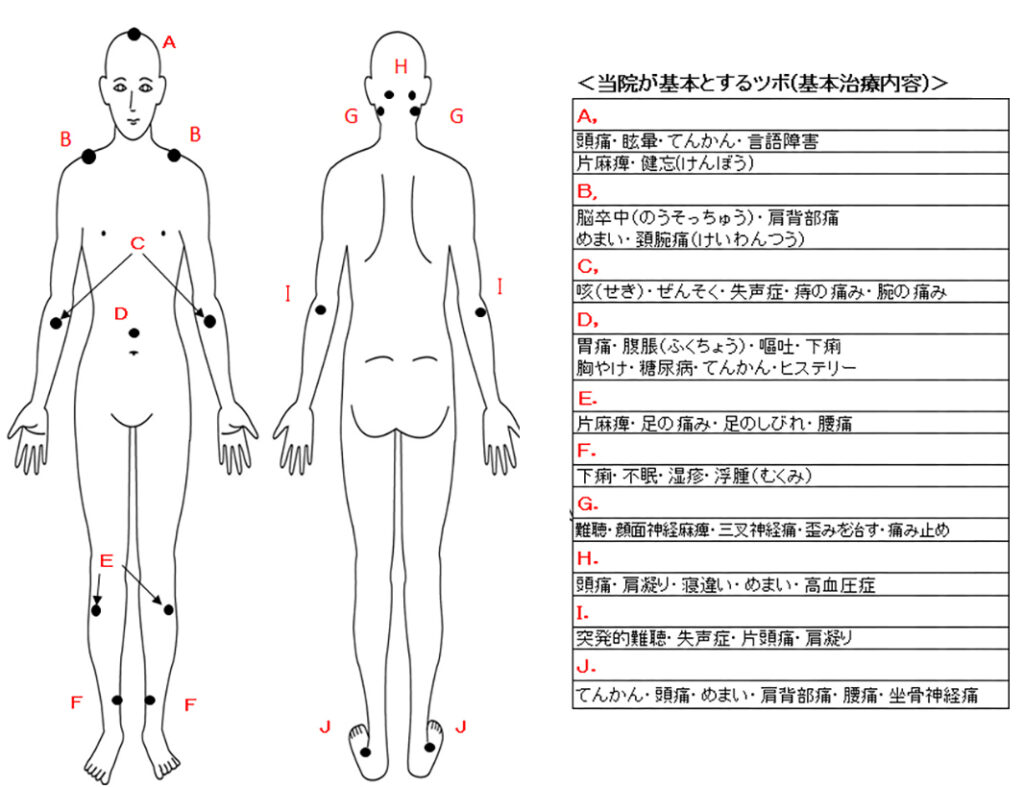 - 委中、飛陽、崑崙(イヒコン)、一過性脳虚血による目眩、吐き気、四肢の痺れ、麻痺、視力障害、嚥下困難、後頭部の頭重感、言語障害、歩行障害などの軽度の症状に有効です)